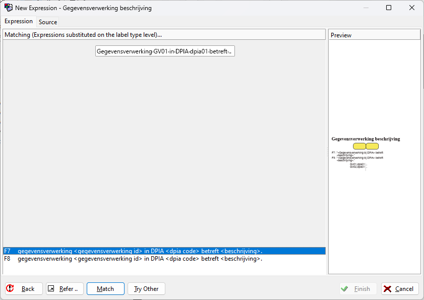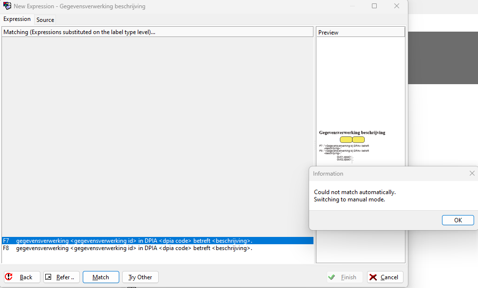 | Steps To Reproduce | The below in expression file. At 'Gegevensverwerking beschrijving' the program is not capable of matching earlier classifications. [DPIA] "DPIA dpia01 bestaat.", F1 "DPIA dpia02 bestaat.", F1 "DPIA dpia03 bestaat.", F1 [Gegevensverwerking] "Gegevensverwerking GV01 bestaat.", F5 "Gegevensverwerking GV02 bestaat.", F5 "Gegevensverwerking GV03 bestaat.", F5 "Gegevensverwerking GV04 bestaat.", F5 "Gegevensverwerking GV05 bestaat.", F5 "Gegevensverwerking GV06 bestaat.", F5 [Gegevensverwerking bij DPIA] "Gegevensverwerking GV01 wordt uitgevoerd in het thema van DPIA dpia01.", F6 "Gegevensverwerking GV02 wordt uitgevoerd in het thema van DPIA dpia01.", F6 "Gegevensverwerking GV03 wordt uitgevoerd in het thema van DPIA dpia01.", F6 "Gegevensverwerking GV04 wordt uitgevoerd in het thema van DPIA dpia02.", F6 "Gegevensverwerking GV05 wordt uitgevoerd in het thema van DPIA dpia02.", F6 "Gegevensverwerking GV06 wordt uitgevoerd in het thema van DPIA dpia03.", F6 [Gegevensverwerking beschrijving] "Gegevensverwerking GV01 in DPIA dpia01 betreft ...", F9 "Gegevensverwerking GV02 in DPIA dpia01 betreft ...", F10 "Gegevensverwerking GV03 in DPIA dpia01 betreft ...", F11 "Gegevensverwerking GV04 in DPIA dpia02 betreft ..." "Gegevensverwerking GV05 in DPIA dpia02 betreft ..." "Gegevensverwerking GV06 in DPIA dpia03 betreft ..." | ||||