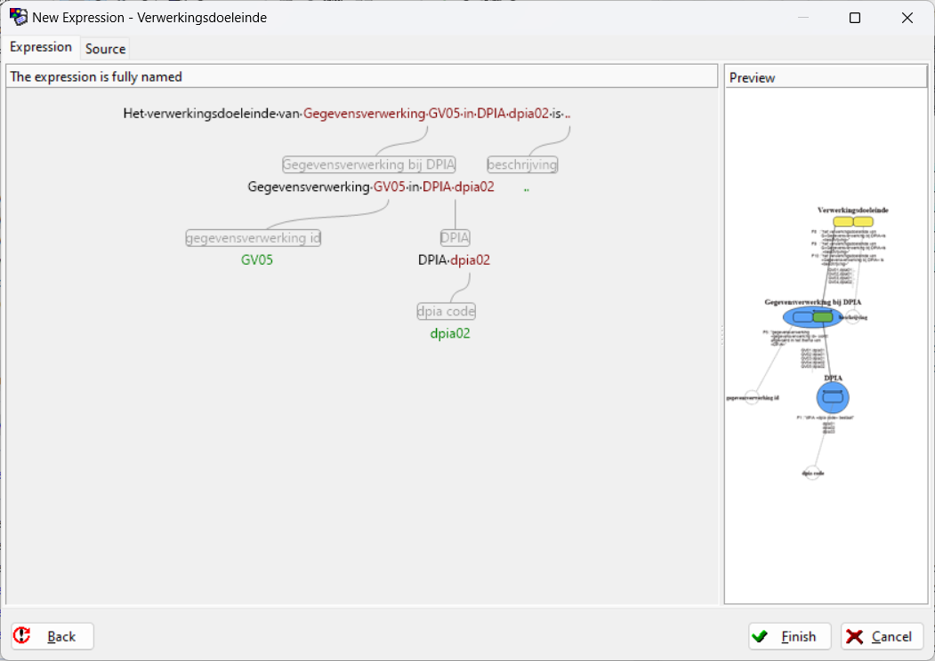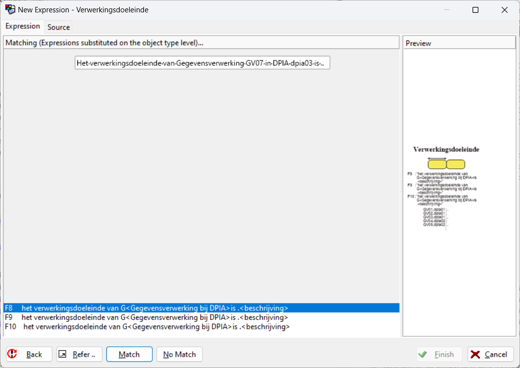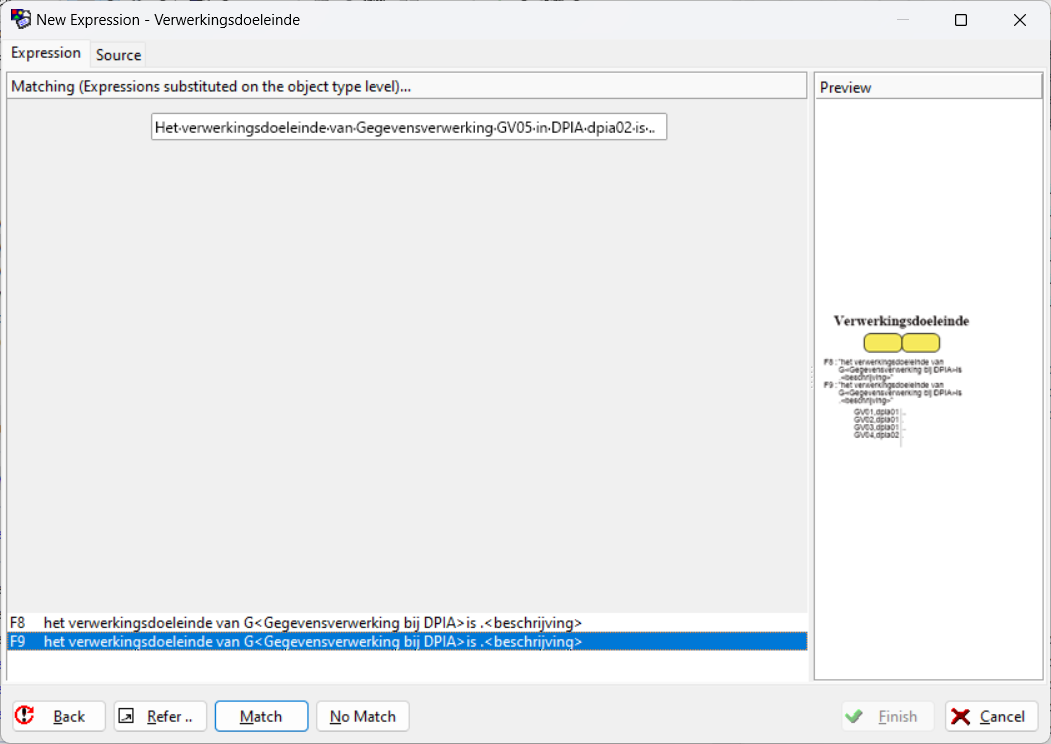 | Description | Classification window asks to match expression with already known fact type expressions. The shown fact type expressions, however, show an error: 'het verwerkingsdoeleinde van G<Gegevensverwerking bij DPIA> is .<beschrijving>' --> The 'G' in front of '<Gegevensverwerking...' is not correct. Perhaps this is related to why the classification is not able to find a match. See additional information for a step-by-step showing. | ||||