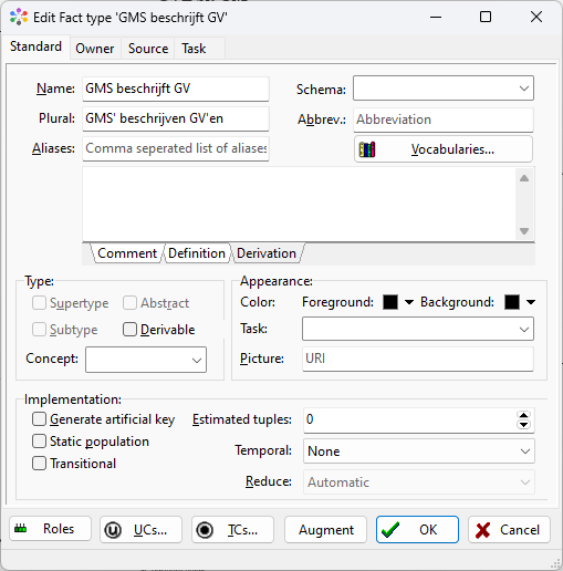 - However, I do not want it to be derivable anymore, hence, I edit its information, uncheck the 'Derivable' check box, and empty the text under 'Derivation'