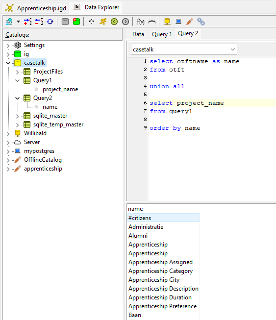 | Description | Use query output as virtual table in the casetalk-schema to build cross database queries. | ||||