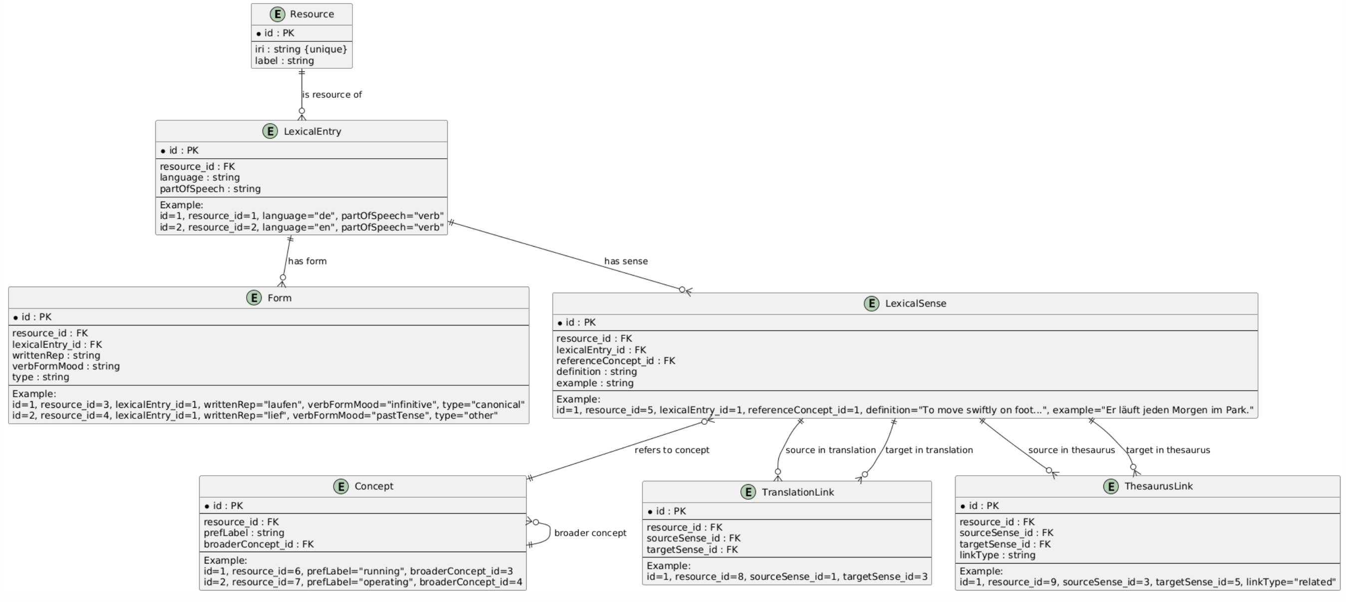 | Description | A minimal working RDF/Turtle model for the word pair German: laufen (English: run), with forms, senses, translations, and thesaurus relations. This follows OntoLex-Lemon (W3C standard for lexical data on the semantic web), plus SKOS for thesaurus-style relations, and LexInfo for part-of-speech/morphology. | ||||