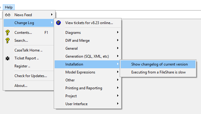 | Under the Help Menu a ChangeLog is now added which fetches the tickets from the online system, and allows the user to read up on them, or view them online. | |