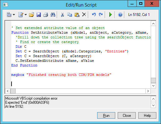 | Description | Sometimes the PowerDesigner VB Script cannot be run. The cursor is placed at the end of the file and the vb compiler says if was expecting an 'end'. | ||||