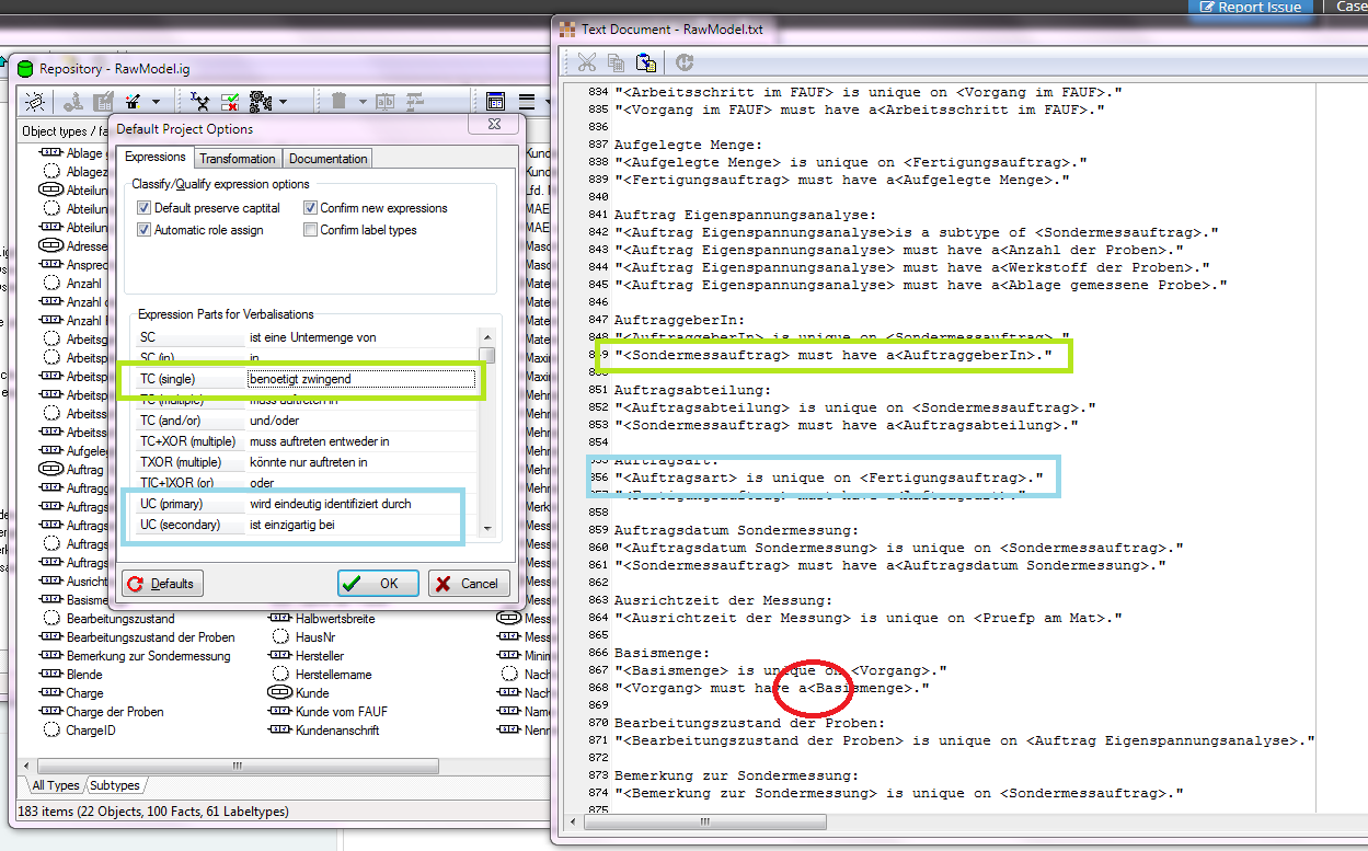 | Description | I am working with german Fact Types and Verbalizations, so I changed the Expression Parts for Verbalization in Casetalk (Run -> Options -> Expressions). These german verbalization parts are not used in the generation of the expressions for the domain expert. Another mistake here is, that there are missing empty spaces after a few of the expression parts (see picture for example after "must have a_" I am actually working with the pre-release-Version 8.26 for education version. | ||||