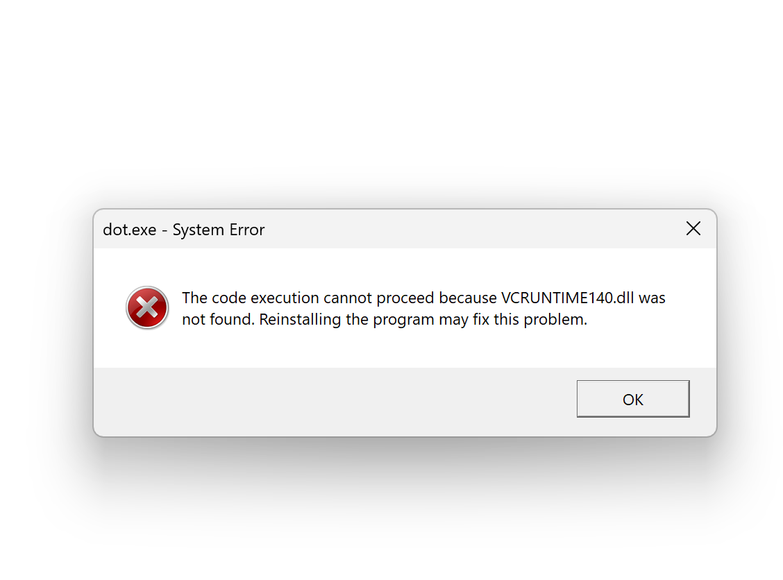 | Description | Some Windows machines lack vcruntime140.dll which is required by Dot. And Dot is required by PlantUML for generating diagrams. CaseTalk should check the absence of it, and prevent a system dialog by dot.exe. It is confusing. | ||||