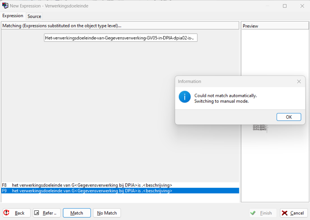 | Description | Classification window asks to match expression with already known fact type expressions. The shown fact type expressions, however, show an error: 'het verwerkingsdoeleinde van G<Gegevensverwerking bij DPIA> is .<beschrijving>' --> The 'G' in front of '<Gegevensverwerking...' is not correct. Perhaps this is related to why the classification is not able to find a match. See additional information for a step-by-step showing. | ||||