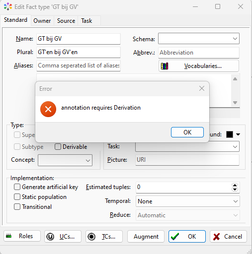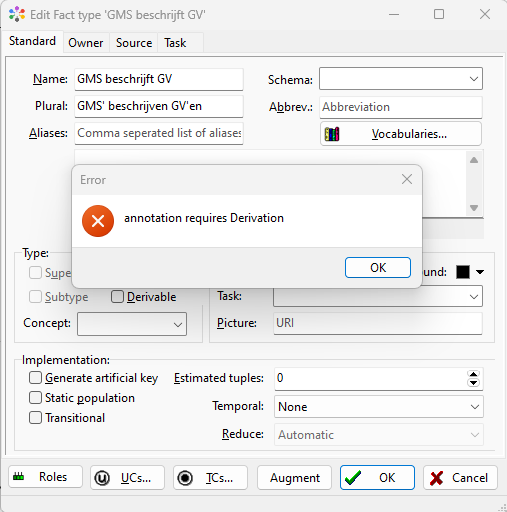 | Description | At first, I thought it was about objects that are no longer a derivable: - 'GMS beschrijft GV' is derivable, hence, is noted by an asterix (*) - However, I do not want it to be derivable anymore, hence, I edit its information, uncheck the 'Derivable' check box, and empty the text under 'Derivation' - when I click 'OK', I get the error 'annotation requires Derivation', and are unable to save my information. Actually, it also happens with facts that were never derivable: - I open 'GT bij GV', which was never derivable - Looking at its info, there is no text under 'Derivation'. - I change nothing, click 'OK', but get the same error. | ||||