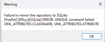 DescriptionSince UML icons are introduced we get UNIQUE constraint errors on UML_ATTRIBUTES.CLASSNAME, UML_ATTRIBUTES.ATTRIBUTE, with SQLite saying it cannot mirror to the repository.